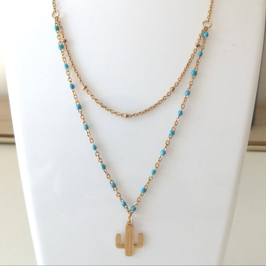 Collier "ARIZONA" – Perles turquoise & cactus doré en acier inoxydable